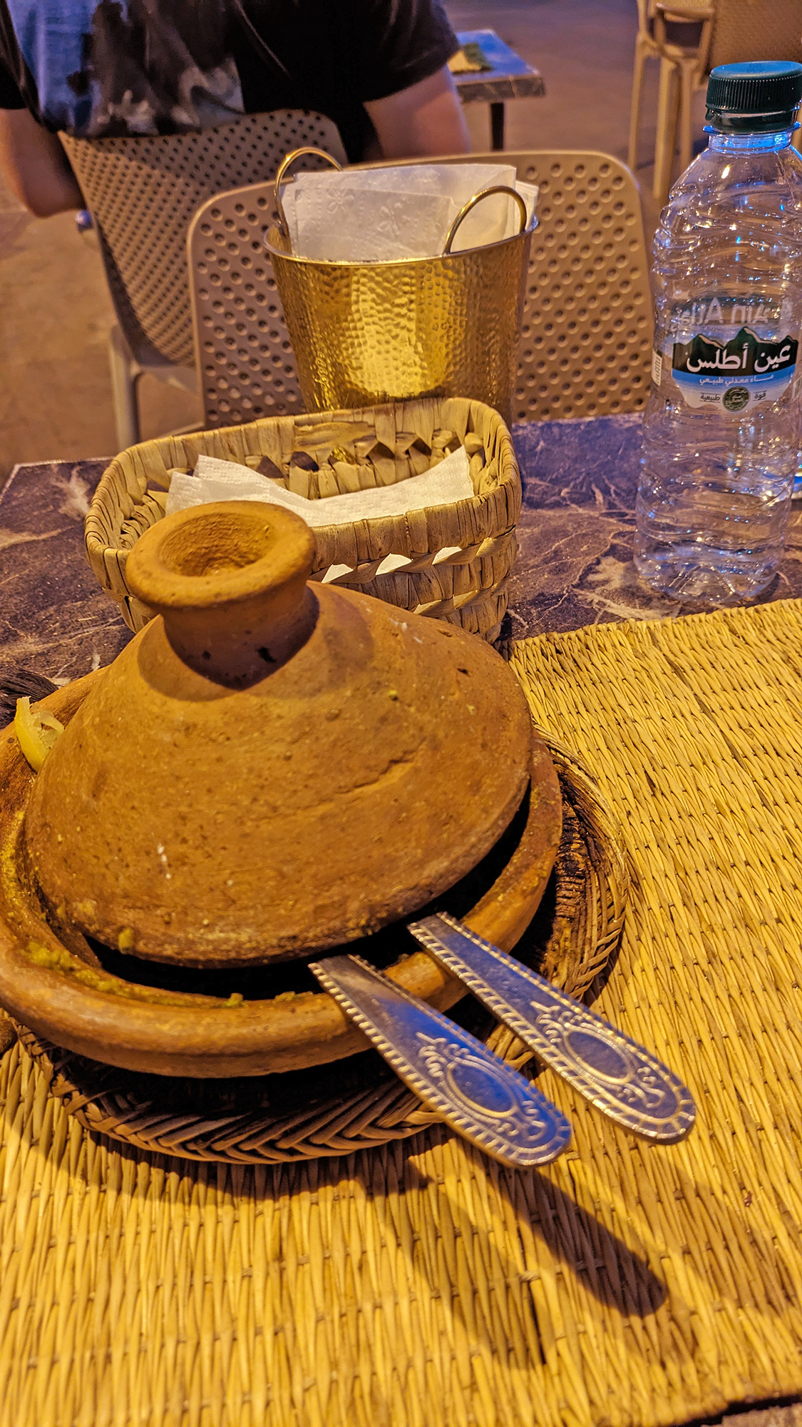einigen Lokalen sitzen die Leute beim Essen zusammen. Ich lasse mich in einem Restaurant nieder und bestelle Salat und Tajine. Der