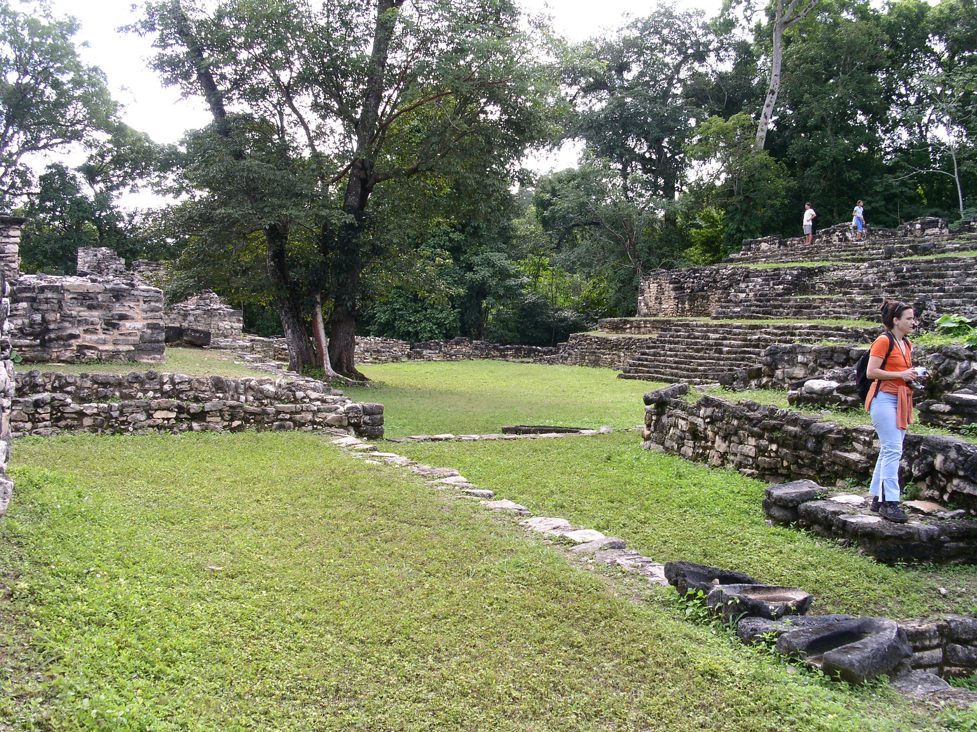 Eine Bootsstunde den Fluss hinab liegt in einer Schleife über den Sandbänken die Mayaruine von Yaxchilan. Die Kosten von 600 Peso handle ich auf fünfhundert (55 Fr.) herunter und der Betrag halbiert sich dank einem ungarischen Paar das sich uns anschliesst noch. Von Tieren ist nicht viel zu sehen, dafür vom bescheiden Leben der Menschen. Da in der Bootsmiete der Eintritt inbegriffen ist, konnen wir gleich den Hügel mit der kleinen Nord-Akropolis erklimmen. Leider ist durch die Bäume die Sicht auf den Fluss versperrt, dafür ist eine Horde Affen von unserem Aufeinandertreffen genauso erstaunt wie wir. Auf der tiefer gelegen Hauptplaza überrascht uns ein Platzregen und wir suchen Schutz im Fledermaustempel. Zehn Minuten später glänzen die Ruinen wieder im Sonnenlicht. Wir können den Rest der Anlage besichtigen und sehen erstaunlich gut erhaltene Fresken und Dachkämme der Tempel. Mit leicht verschlammten Hosenbeinen treten wir die Rückfahrt in die Unterkunft an. Dabei halten wir kurz am guatemaltekischen Ufer, wo ich meine restlichen Quetzales in Bier verwandle, da es in der Lodge keines gibt. Neben der Kaufbude warten einige Leute mit Gepäck. Ich vermute bis die Dämmerung ihre Flussüberquerung verhüllt.