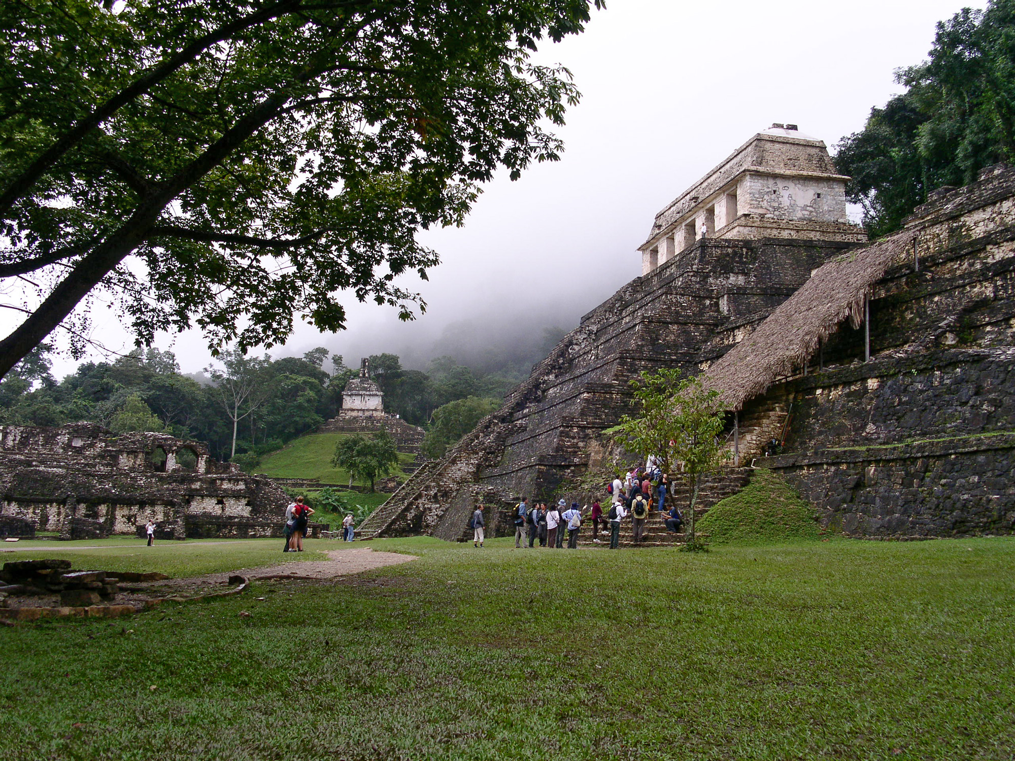 Erneut stehen wir dank guter Auskunft zur falschen Zeit an der Bushaltestelle. Diesmal neunzig Minuten zu früh. Um elf wird unser Gepäck gegen Regen unter einer Plane auf dem Dach des Toyota verstaut und wir es kann mit einigen Einheimischen zusammen losgehen. Ganz so kurz wie die efektiv notwendigen eineinhalb Stunden dauert unsere Fahrt nicht. Während mehrer Militärkontrollen sind zwei Guatemalteken die ihre Landbesitzpapiere erneuern müssen Grund alle aussteigen zu lassen. Der Staat reagiert auf die Unruhen der verarmten Chiapas-Indigenas und Menschen- und Drogenschmuggel auf diese Weise. Wir Bleichgesichter bleiben unnbehelligt. Die Ortschaft Palenque ist eigentlich ein den nahegelegen Mayaruinen dienendes Retortenstädtchen. Trotzdem ist es schön wieder eine gewisse Auswahl an Essen zu haben. Endlich müssen wir unsre Pässe noch mit den notwendigen Stempeln versehen lassen und fahren dazu zur einige Kilometer ausserhlb gelegen Immigration. Unser vorschnell als gut und günstig eingestuftes Hotel beherbergt nicht nur laute Gäste die wir ruhig stellen, sondern auch noch Wanzen in den wegen den kalten Nächten georderten Decken! Immerhin sind die an einem Berghang gelegenen Ruinen eine Wucht, und wir geniessen den Tag durch die Anlage schlendernd. Der Ehemals von aussen abgeschottete Haupttempel beherbergt eine Art Glockenturm. Der daneben fliessende Bach wurde zur Sicherheit kanalisiert. Da wir uns einen Führer sparen horchen wir bei grösseren Turistengruppen rein und so erfahre ich, dass die Dachkämme der Tempel nicht nur zur Zierde sondern auch als zentraler Ballast zur Beschwerung der Gewölbe dienten. Die Mayas kannten keine selbsttragende Kuppelkonstruktion wie wir. Auf dem Weg ins tiefergelegene Museum durchqueren wir den Wohnbezirk des Adels der nahe des über Kalksteinbecken fliessenden Baches liegt. Die Oberschicht wusste zu leben. Die Ausstellung enthält einige schöne Stelen und Urnen mit guter Beschreibung. Auf dem Rückweg in den Ort kaufen wir noch Erstklass- Busbillette für den nächsten Tag.