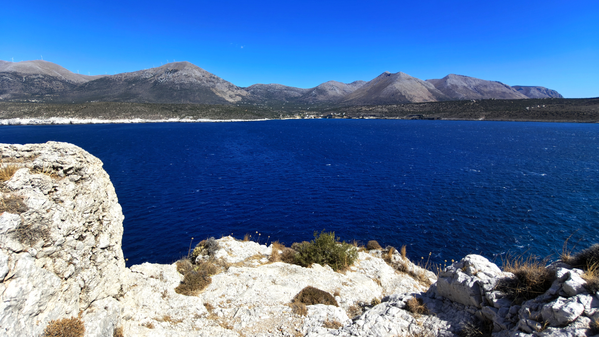 Es windet immer noch. Immerhin ist der Himmel wolkenlos. Am späten Morgen fahren wir südlich nach Mezapos. Ein kleines Dorf an der