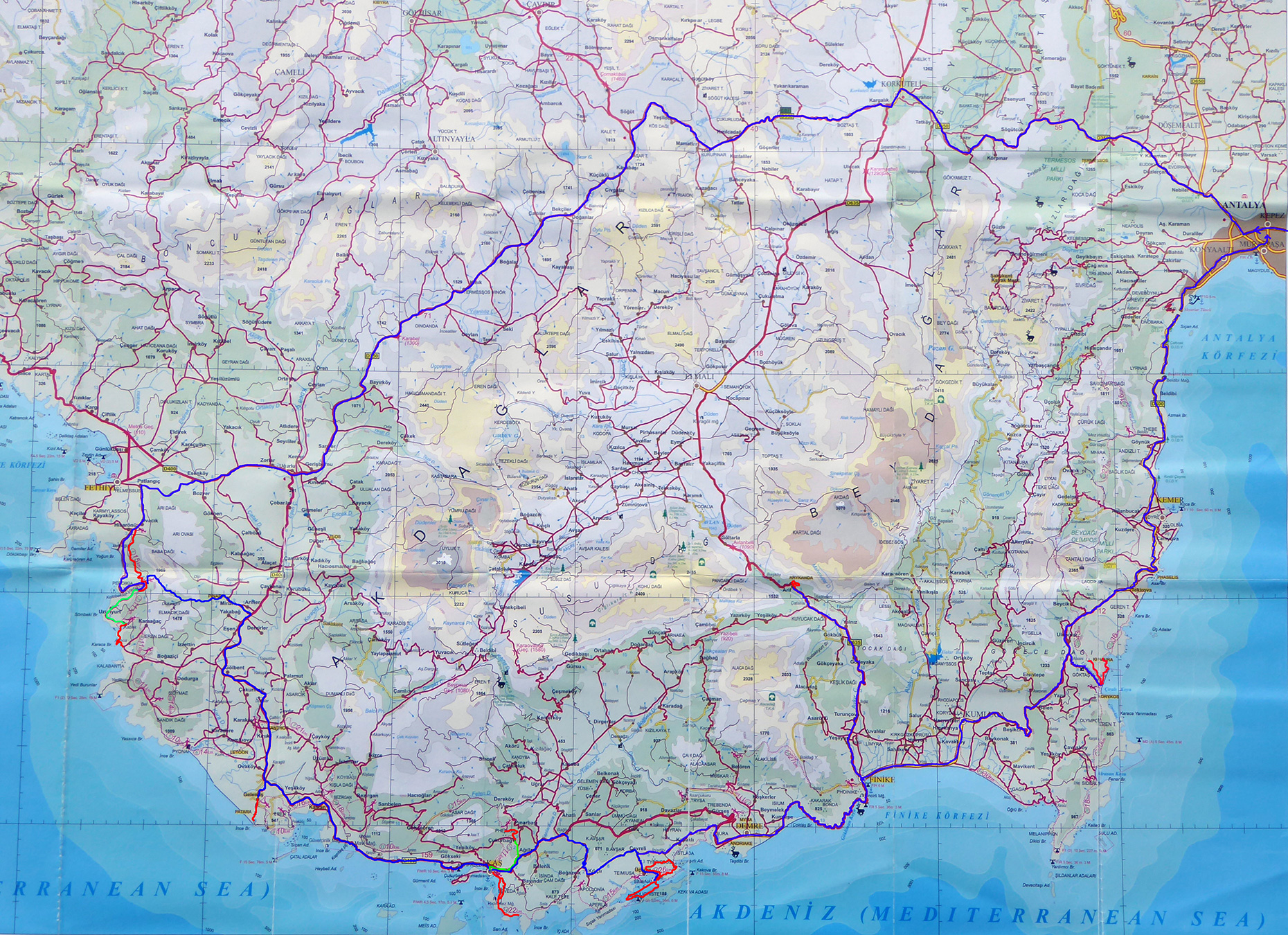 Unsere in der Türkei gefahrenen Verbindungsstrecken in blau. Die Anfahrten in grün und die Wanderungen in rot.