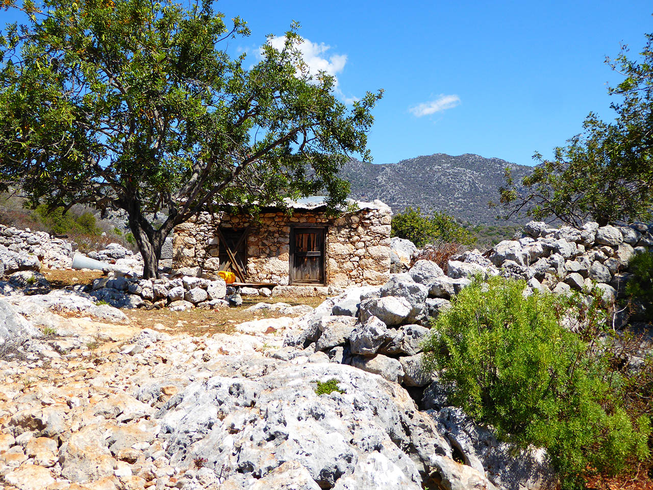 bleiben. Gelegentlich passieren wir eine kleine steinige Weide mit uralten Olivenbäumen. In einer grösseren Senke ist das