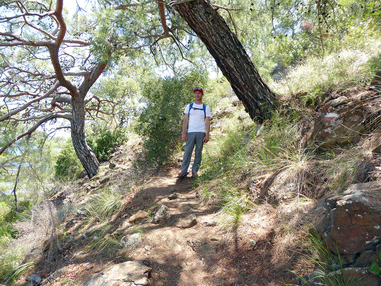 Gleich zu Beginn geht es durch lichte Pinienwälder steil bergan. Bei 25 Grad brauche ich noch etwas Angewöhnung